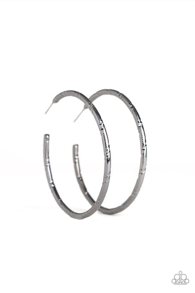 Etched in ribbons of diamond-cut shimmer, a shiny gunmetal hoop curls around the ear for a classic look. Earring attaches to a standard post fitting. Hoop measures 2 1/4" in diameter.