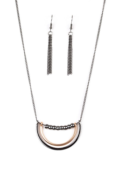 A strand of shiny gunmetal beads give way to bowing gold and gunmetal frames, creating an edgy pendant below the collar. Features an adjustable clasp closure.