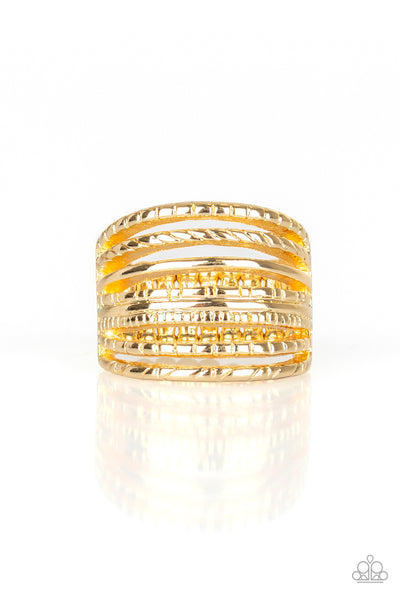 A collection of smooth and textured gold bars arc across the finger, stacking into a thick layered band. Features a stretchy band for a flexible fit.