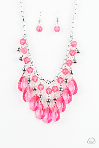 Faceted crystal-like teardrops in a gorgeous pink hue dance along the neckline with shiny silver beads and smaller pink crystal-like beads creating a dramatic flair. Features an adjustable clasp closure.