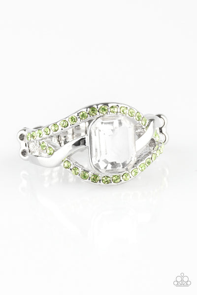Glistening silver bars and green rhinestone encrusted bands swirl across the finger, coalescing into an airy band. Featuring a regal emerald style cut, a glittery white gem is pressed into the center of the frame for a refined finish. Features a dainty stretchy band for a flexible fit.