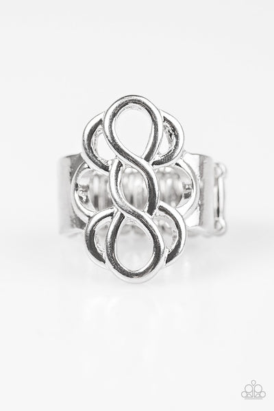 Brushed in a glistening finish, shiny silver bars loop across the finger, joining into an airy frame.