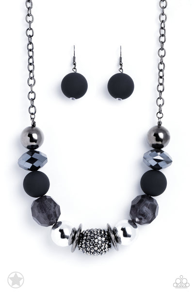 Sophisticated beads in shades of gunmetal and black with reflective faceted edges and varying glazed finishes are offset by two shiny silver beads. An oblong bead studded with gunmetal rhinestones adds a dramatic accent. Features an adjustable clasp closure.