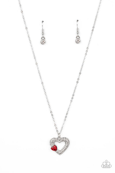 A luxurious airy silver heart lush with glassy white rhinestones swings from a classic silver chain. A faceted heart gem brushed in a red shimmer graces one side of the larger bedazzled heart for a romantic finish. Features an adjustable clasp closure.