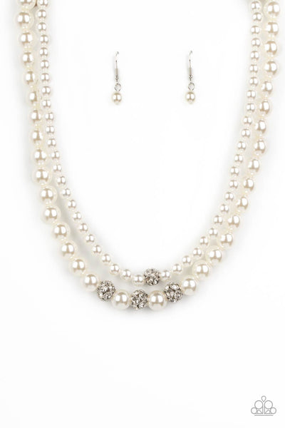 Two strands of classic white pearls in varying sizes coalesce around the collar in a refined fashion. Silver beads, encrusted in white rhinestones, introduce shimmery detail to each pearly layer, adding a playful spark of shimmer to the timeless design. Features an adjustable clasp closure.