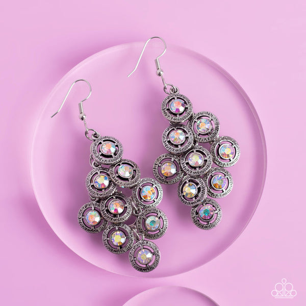 Dotted with iridescent rhinestone centers, tiers of textured silver frames cascade from a metallic backdrop for a stellar tasseled look. Earring attaches to a standard fishhook fitting.