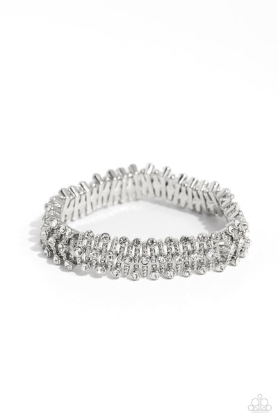 Infused along a stretchy band, studded, curved silver bars dotted with white rhinestones wraps around the wrist for a glitzy display.