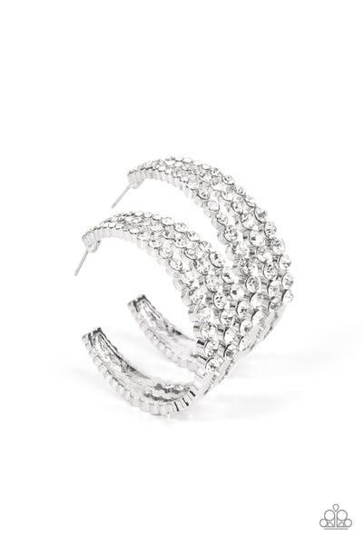 Cascading layers of sparkling white rhinestones plunge into flattened silver plates creating a stunning eye-catching hoop earring. Earring attaches to a standard post fitting. Hoop measures approximately 2" in diameter.