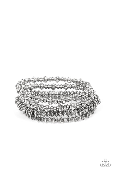 An antiqued assortment of studded, round, and decorative silver beads are threaded along stretchy bands around the wrist, creating rustic layers.
