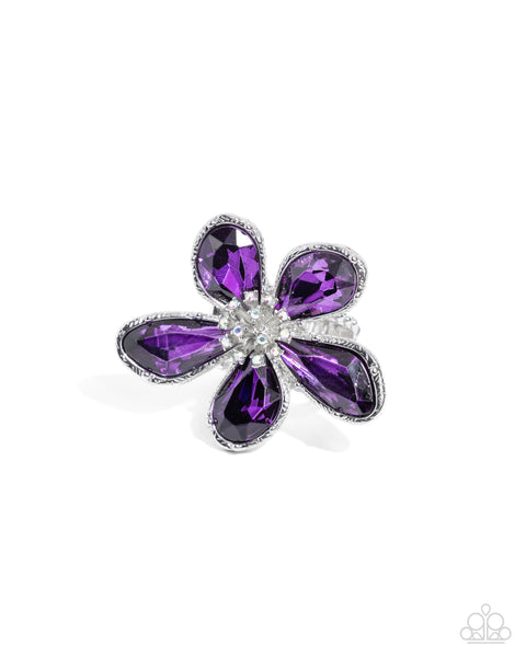 Featuring abstract, purple gem petals in textured silver frames, an oversized silver flower blooms atop the finger. Dainty iridescent rhinestones create realistic anther-inspired dazzle from a silver filament center for a refined finish. Features a stretchy band for a flexible fit. Due to its prismatic palette, color may vary.