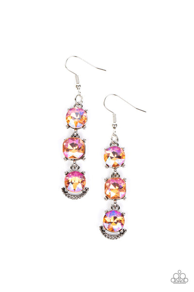 A trio of iridescent orange rhinestones, set in pronged silver fittings, stack one above the other. The center rhinestone is almost imperceptibly square rather than round and the final rhinestone is accented with a gritty metallic crescent etched with ropelike texture, creating a ruggedly glamorous lure. Earring attaches to a standard fishhook fitting. Due to its prismatic palette, color may vary.