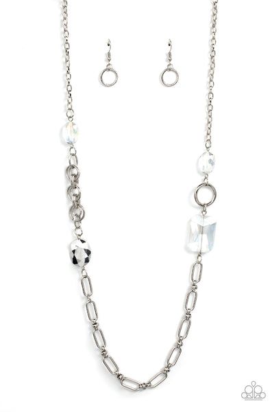 A mismatched assortment of oval, round, textured, and silver hoops haphazardly link into a chaotic chain below the collar. Featuring oval and emerald style cuts, oversized white and iridescent gems sporadically adorn the chain for a glitzy finish. Features an adjustable clasp closure.