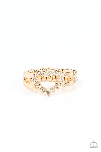 White rhinestone pronged gold fittings coalesce into an airy heart frame atop the center of layered gold frames, resulting in a romantic centerpiece atop the finger. Features a dainty stretchy band for a flexible fit.
