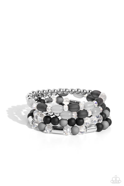 A shimmery collection of silver beads and accents, glassy long black and gray beads, faceted clear beads, and black and gray acrylic beads are threaded along stretchy bands around the wrist, creating glistening layers.
