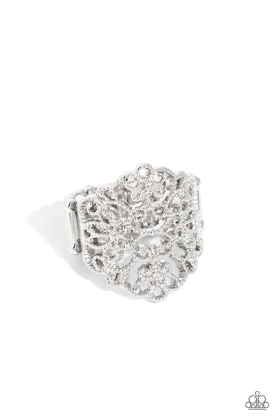 Brushed in a studded shimmer, glistening silver floral filigree vines across the finger for a seasonal look. Features a stretchy band for a flexible fit.