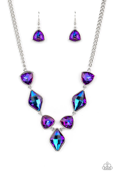 Set in silver frames, glittering geometric purple shapes with a UV shimmer delicately coalesce around the collar for a statement piece. Features an adjustable clasp closure. Due to its prismatic palette, color may vary.