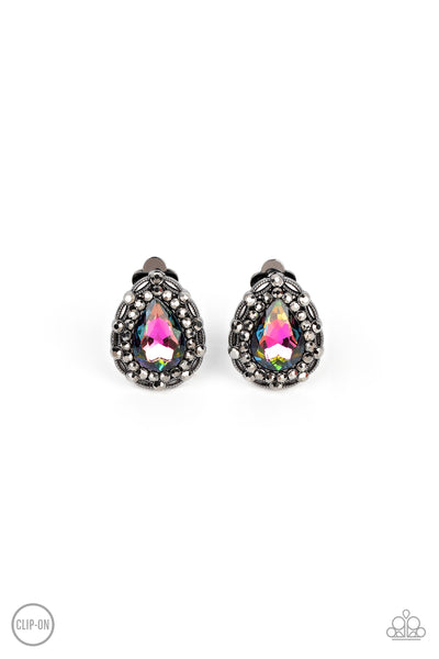 An oversized oil spill teardrop gem is elegantly bordered in glitzy hematite rhinestones atop a decorative gunmetal frame, culminating into a smoldering twinkle. Earring attaches to a standard clip-on fitting.