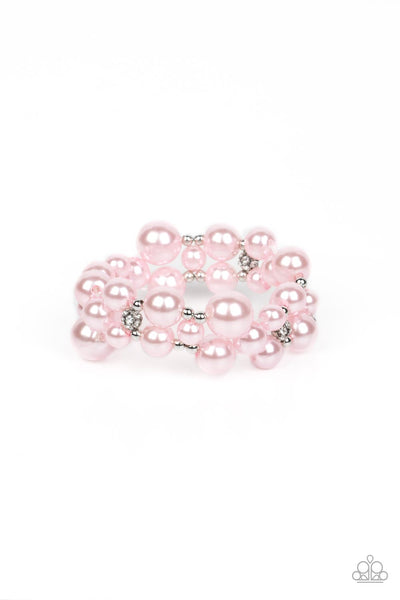 A bubbly collection of pink pearls, dainty silver beads, and white rhinestone encrusted accents are threaded along braided stretchy bands around the wrist, resulting in an elegant effervescence.