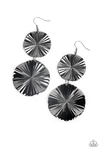 Crinkled with texture, folded gunmetal discs radiate as they delicately link into a tactile lure for a stunning metallic finish. Earring attaches to a standard fishhook fitting.