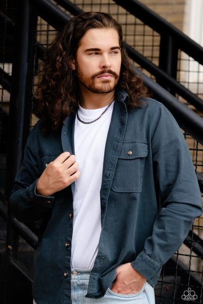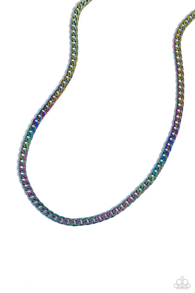 Featuring a flattened finish, oil spill links daringly interlock into a dainty curb-like chain across the chest for a stellar urban finish. Features an adjustable clasp closure.