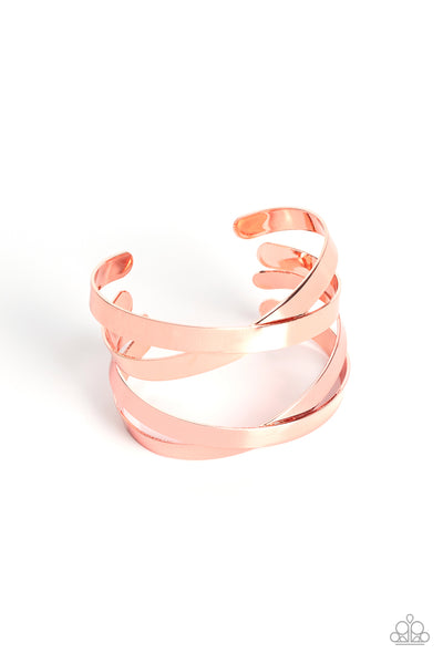 Brushed in a high-sheen finish, two sets of flat shiny copper bands crisscross over the wrist as they wrap into a lustrous cuff giving off an industrial vibe.
