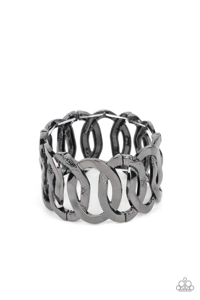 Large gunmetal hoops brushed in glittery, gritty texture alternate with smooth gunmetal hoops featuring a high sheen finish. The oversized links overlap as they alternate around the wrist on stretchy bands, culminating in an industrial statement piece.