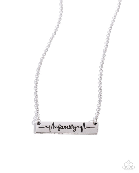 The word "Family," is inscribed between symbolic life lines on a rectangular silver plate creating an affectionate keepsake on a dainty silver chain below the collar. Features an adjustable clasp closure.