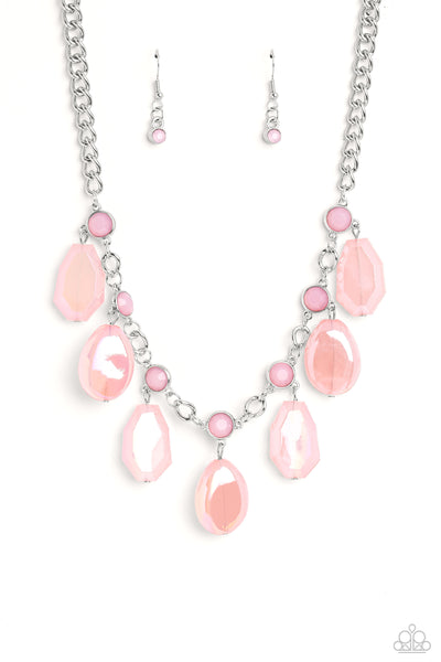 A collection of chiseled, clear and milky geometric shapes in pink hues feature an iridescent overlay as they cascade from a silver curb chain, resulting in a bubbly and boisterous fringe below the collar. A layer of faceted milky pink beads are infused along the silver chain for an additional pop of color. Features an adjustable clasp closure.