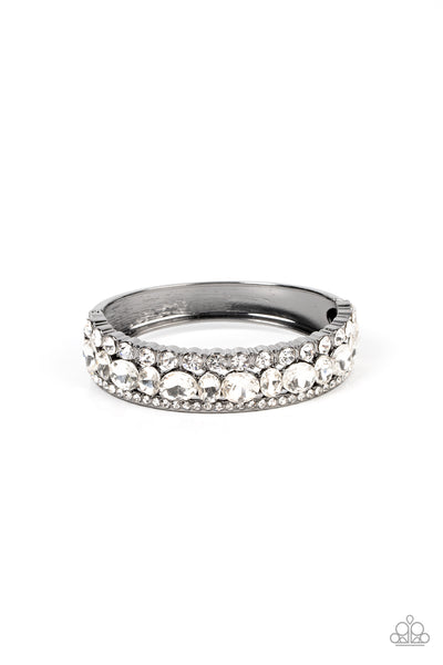 Three blinding rows of mismatched white rhinestones dramatically stack across the wrist, coalescing into a majestic bangle-like centerpiece. Features a hinged closure.