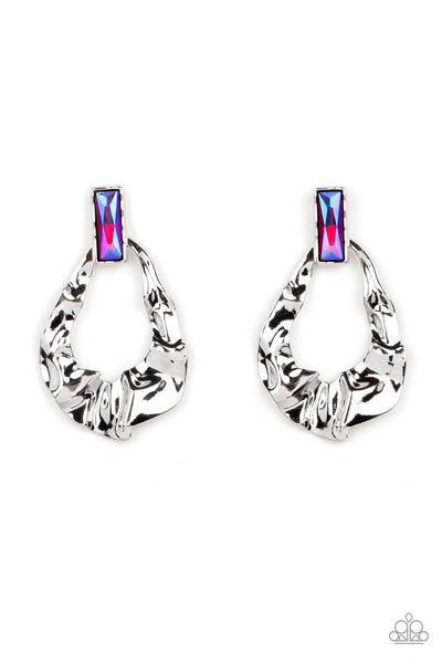 Folds of warped silver delicately gather into an edgy teardrop at the bottom of an emerald cut iridescent pink rhinestone. Earring attaches to a standard post fitting. Due to its prismatic palette, color may vary.