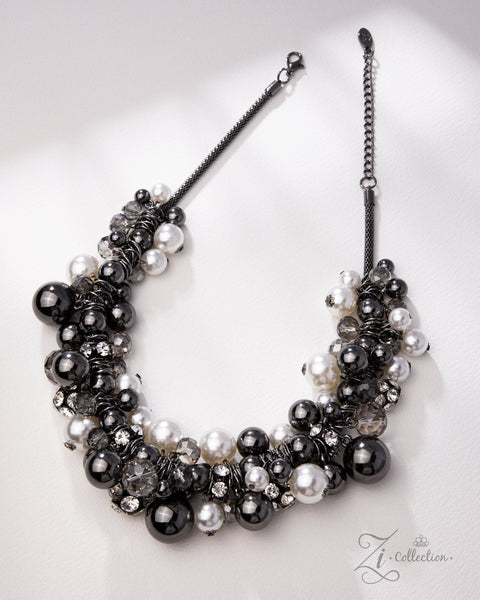 An attention-commanding collection of glossy gunmetal spheres, faceted smoky beads, glistening white pearls, sleek gunmetal rings, and rhinestone-encrusted gunmetal accents in varying sizes collide in a fierce explosion of texture and shine. Cascading below the collar along a bold gunmetal mesh chain, the dramatic clusters swing with an air of sophistication, while the multi-dimensional palette of shimmer and polish evokes a powerfully poised presence. Features an adjustable clasp closure.