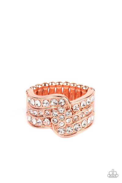Rows of dainty white rhinestones decorate thick wavy bands of shiny copper that curl around the finger. A small white rhinestone flower emerges at the center where the shiny copper bands overlap in a whimsical finish. Features a stretchy band for a flexible fit.