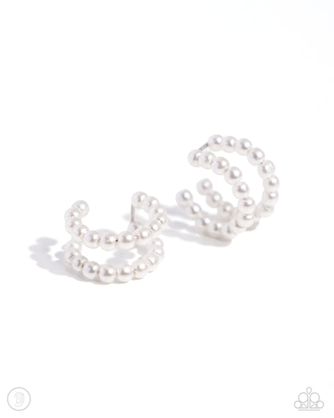 Infused along an invisible wire, a double-layered display of glossy white pearls curls around the ear creating an adjustable, one-size-fits-all refined cuff.