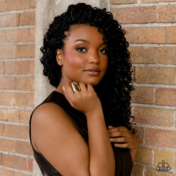 A thick band of glistening gold arcs across the finger, with two sharp points jutting out at the ends, coalescing into a bold, asymmetrical centerpiece. Features a stretchy band for a flexible fit.