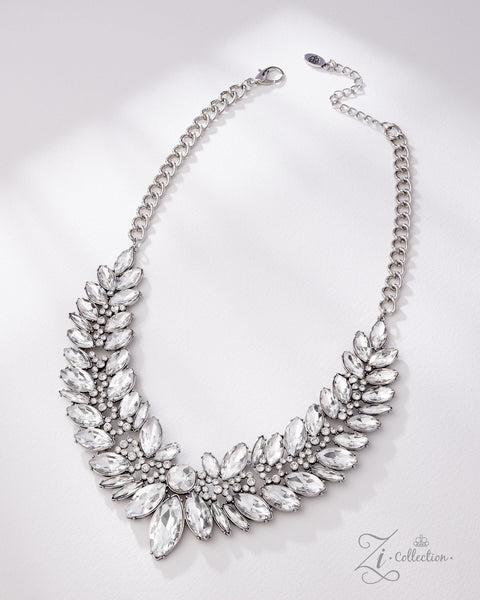 An icy collection of oversized round and marquise-cut white gems daringly fan out from the collar, coalescing into intense interconnected frames. The dauntless display of dazzle locks in place around staggered clusters of dainty white rhinestones, creating a stunning sparkle. Features an adjustable clasp closure.