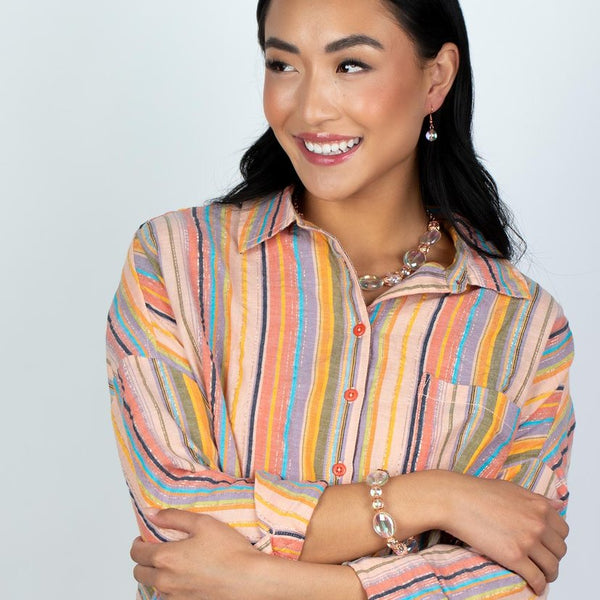 Bubbly iridescent beads in varying sizes drape along the collar, creating a glittery magical effect. Shiny copper cap fittings wrap around the smaller beads, adding vintage metallic detail to the effervescent design. Features an adjustable clasp closure. Due to its prismatic palette, color may vary.