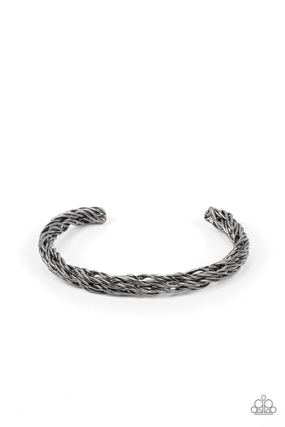 Glistening gunmetal wires twist and coil into a single cuff around the wrist, resulting in a gritty edge.