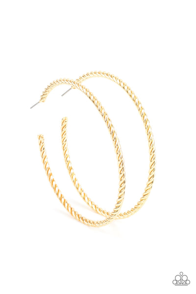 Shiny gold strands twist together to form an edgy statement-making hoop. Earring attaches to a standard post fitting. Hoop measures approximately 2 3/4" in diameter.