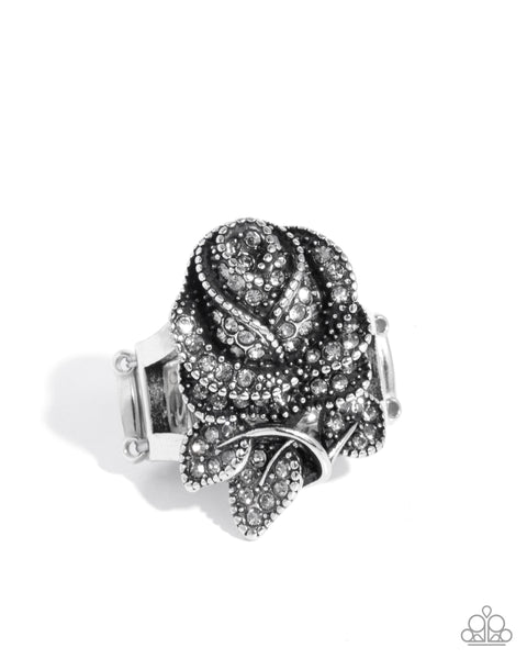 Dotted in smoky rhinestones, a silver-studded blooming three-dimensional silver rose complete with smoky leaves and detailing stands out atop the finger for a whimsically wondrous centerpiece. Features a stretchy band for a flexible fit.