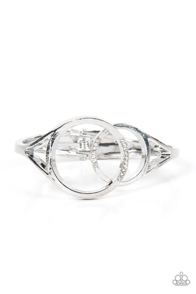 Encrusted in sections of glassy white rhinestones, two oversized silver rings delicately overlap across the center of the wrist, resulting in a timeless bangle-like bracelet around the wrist. Features a hinged closure.
