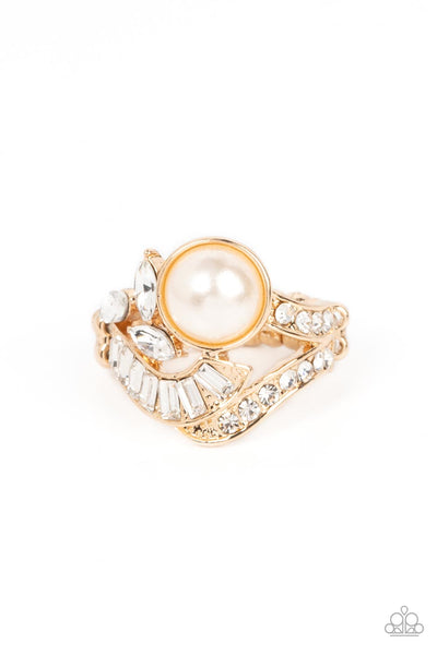 Gold ribbons adorned in round and emerald cut rhinestones delicately nestle around an oversized white pearl. Enhanced with a trio of white marquise cut rhinestones, the lavishly layered centerpiece sparkles atop the finger for an elegant fashion. Features a stretchy band for a flexible fit.