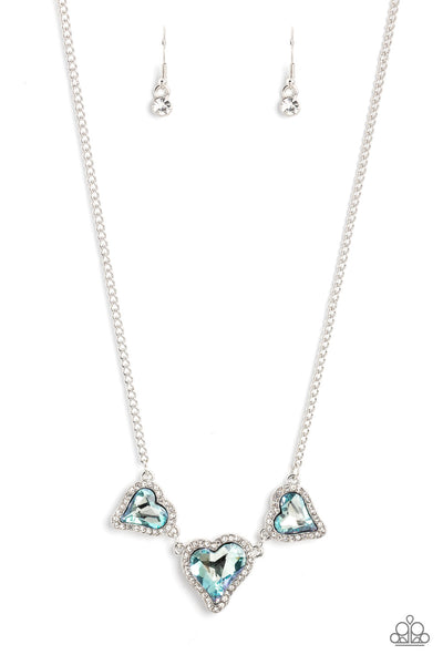 Nestled in white rhinestone frames, a trio of glittery light blue heart-shaped gems delicately links and dangles down the neckline for a dash of swoon-worthy shimmer on a silver chain. Features an adjustable clasp closure.