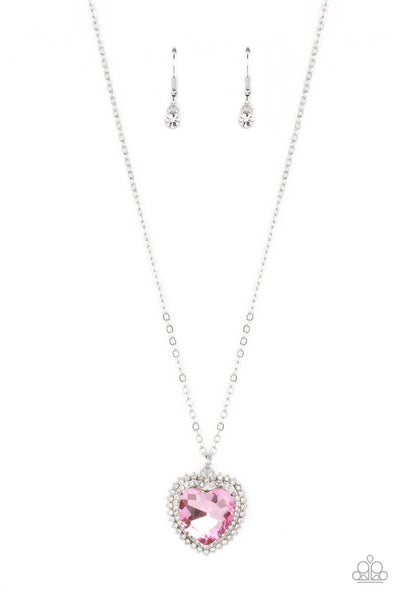 A pink crystal-like heart gem sparkles dramatically as it's wrapped in a glassy white rhinestone-studded heart frame. Adding additional shimmer, a second layer of white rhinestones encircles the studded pendant as it swings from a classic silver chain in a flirty finish. Features an adjustable clasp closure.
