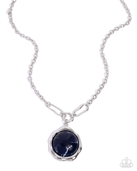 Connecting to a silver cable chain, abstract silver links connect to a central silver disc that features a Crown Blue glossy acrylic bead pressed in a wavy, abstract silver frame for a pop of fun-loving color below the neckline. Features an adjustable clasp closure.