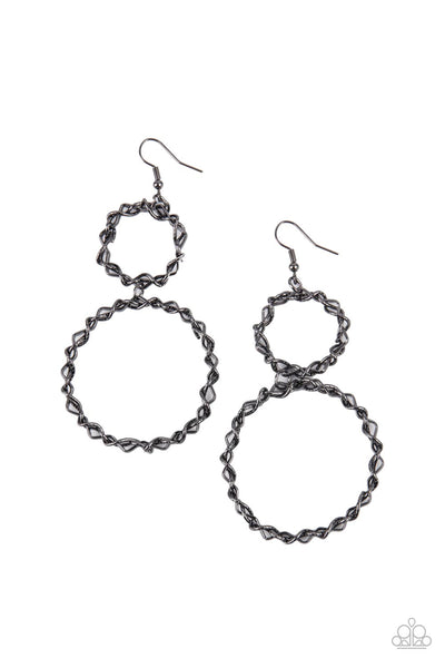 Strands of shiny and textured gunmetal wires are twisted and braided together to form two rugged glittery rings. The larger ring connects to the bottom of the smaller ring, creating a striking lure with an industrial vibe. Earring attaches to a standard fishhook fitting.