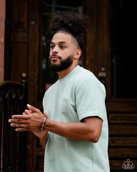Sections of green, blue, red, brown, and black leather wrap around an urban brown leather band. Emerald-cut silver frames stud the centers of each multicolored suede band, adding a touch of industrial grit to the rustic display. Features an adjustable snap closure.
