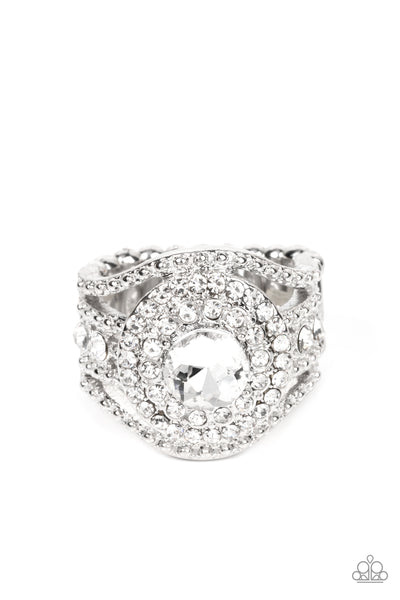 Bordered in stacked rings of glassy white rhinestones, a brilliant white gem sits atop layers of silver studded bars that swoop and stack into blinding bands across the finger. Features a stretchy band for a flexible fit.