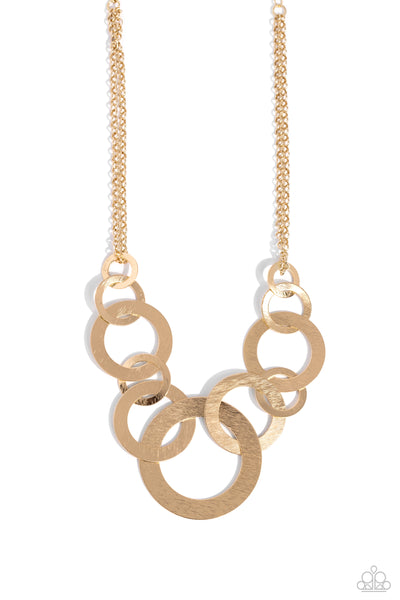 A shiny collection of flat gold rings in varying sizes and brushed in a brilliant gold shimmer, link together below the collar. The assortment of gold rings attaches to a bright gold chain for a dazzling finish. Features an adjustable clasp closure.
