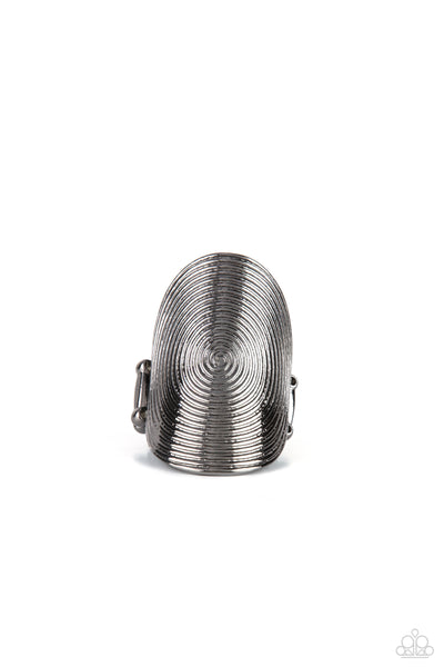 A dizzying swirl is embossed across the front of an oversized gunmetal oval frame, creating an entrancing centerpiece atop the finger. Features a stretchy band for a flexible fit.