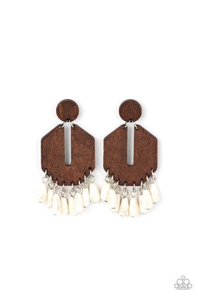 Teardrop white stone beads sway from the bottom of an airy and geometric wooden frame that links to a flat wooden circle, resulting in a western inspired fringe. Earring attaches to a standard post fitting.